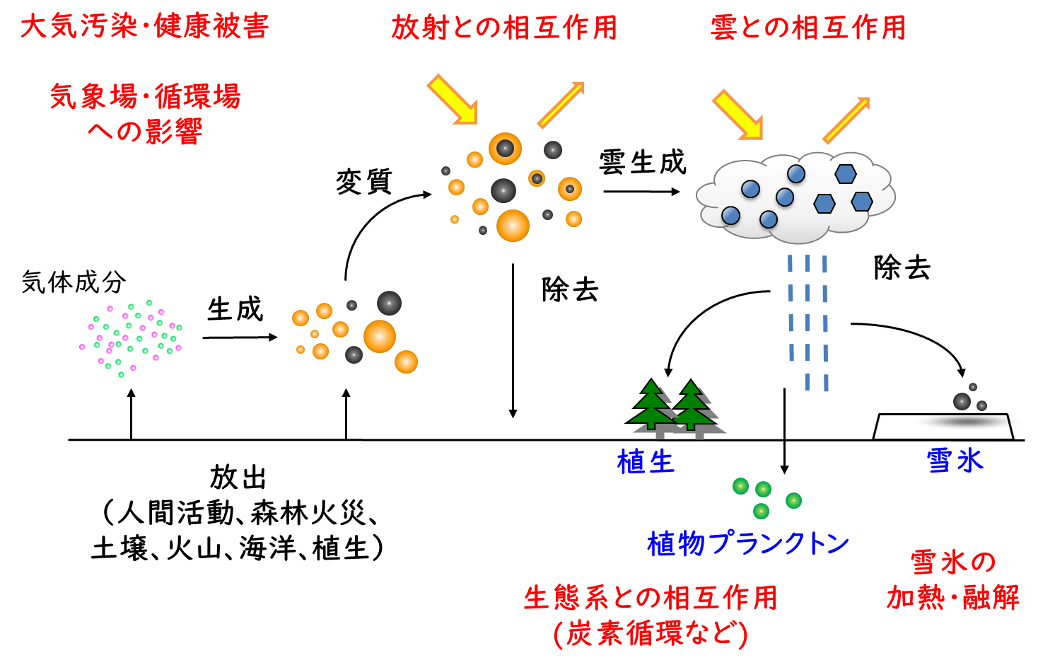 まず、エアロゾルが主に太陽光を散乱したり吸収したりすることで、大気や地表を冷却または加熱します(エアロゾル-放射相互作用)。また、雲粒の核として機能し、雲の性質や降水プロセスなどを変化させます(エアロゾル-雲相互作用)。さらに、「ブラックカーボン」(すす)と呼ばれる黒いエアロゾルが雪氷面に沈着すると、氷河や雪氷の加熱と融解を促進します(エアロゾル-雪氷圏相互作用)。そして、エアロゾルに含まれる栄養塩が陸域や海洋に沈着すると、生態系(植物や植物プランクトン)に影響を与え、大気から陸域・海洋への二酸化炭素の吸収量なども変化させます(エアロゾル-生態系相互作用)。