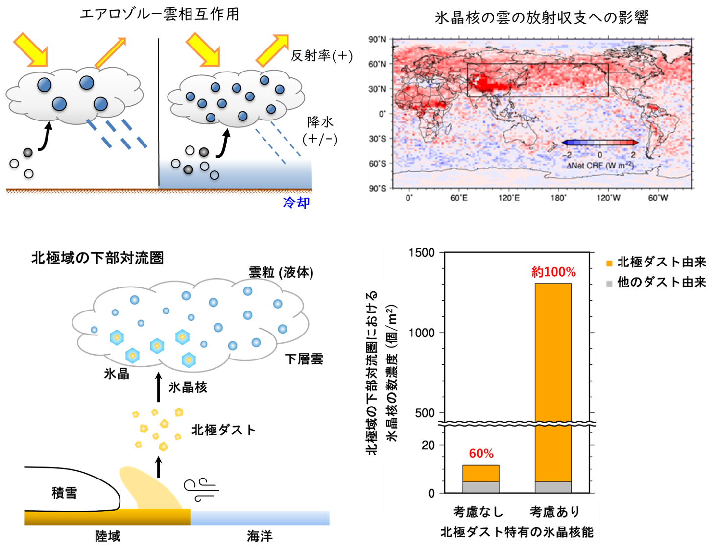 私たちの研究では、エアロゾルの生成過程が、雲の微物理特性(雲粒数、雲水量、雲氷量など)や雲放射強制力への影響推定において重要な役割を果たしていることを解明してきました。たとえば、新粒子生成や有機エアロゾルの生成過程が、雲凝結核の数濃度に大きな影響を与え、これが雲粒数濃度や雲放射強制力の推定に不可欠であることを示してきました。また、自然起源のエアロゾル(土壌由来のダスト、海洋由来の有機エアロゾル、植生由来のバイオエアロゾルなど)が氷晶核粒子として機能するプロセスをモデル化し、これらが雲の微物理特性や雲放射強制力に与える影響を明らかにしてきました。エアロゾルが氷晶核粒子を介して雲に与える影響の不確実性は大きく、この理解を深めることが今後の重要な課題です。