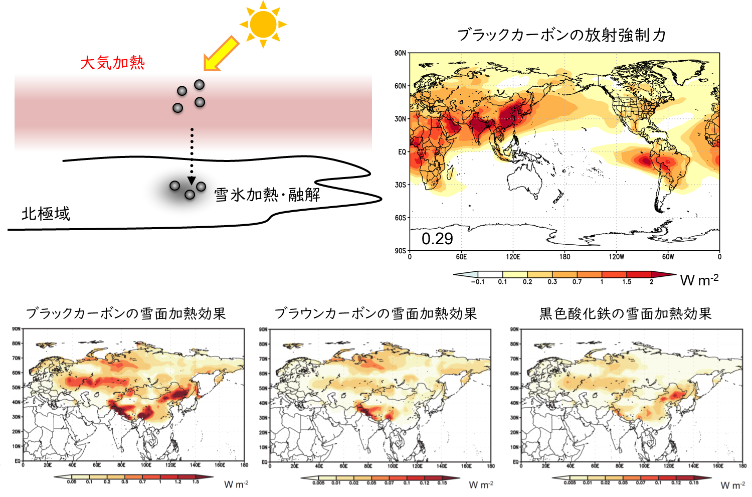 ブラックカーボンに代表される光吸収性粒子は、太陽放射を効率的に吸収し、大気や雪氷面を加熱します。こうした放射加熱は、地球温暖化や氷河・雪氷の融解にも関わる重要な過程です。しかし、このプロセスには大きな不確実性があり、エアロゾルが気候に与える影響を正確に理解するにあたって重要な研究課題の1つとなっています。私たちは、独自に開発してきた気候-エアロゾルモデルを用いて、ブラックカーボンの全球分布とその気候への影響をより正確に推定する研究を進めています。