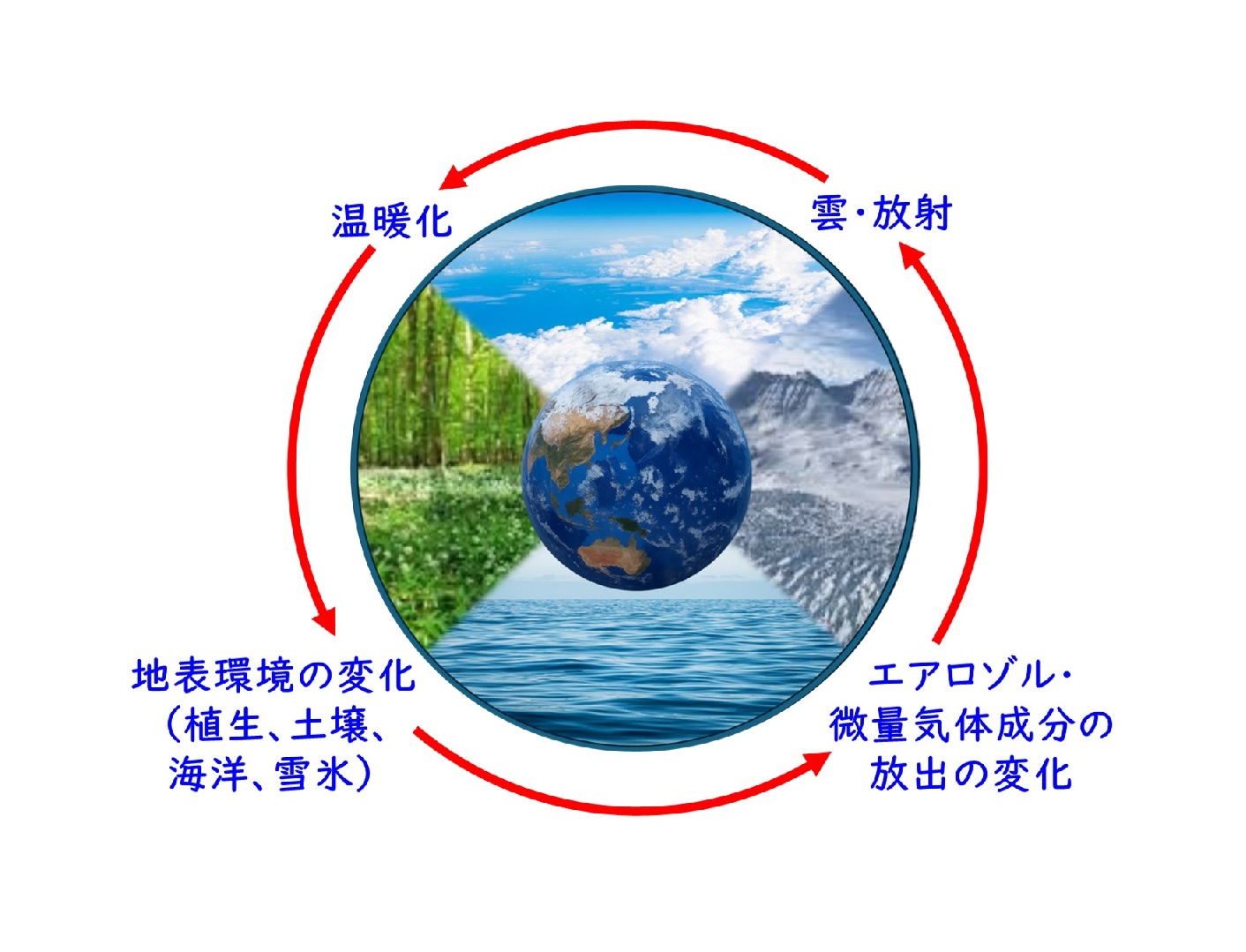 気候変化は、大気だけでなく海洋・陸域・雪氷圏・生態系を含む地球システム全体の相互作用によって決まります。とくに温暖化が進むと、雪氷の融解や植生・森林火災の変化などにより地表環境が変わり、自然起源のエアロゾルや微量気体成分の放出も変化します。